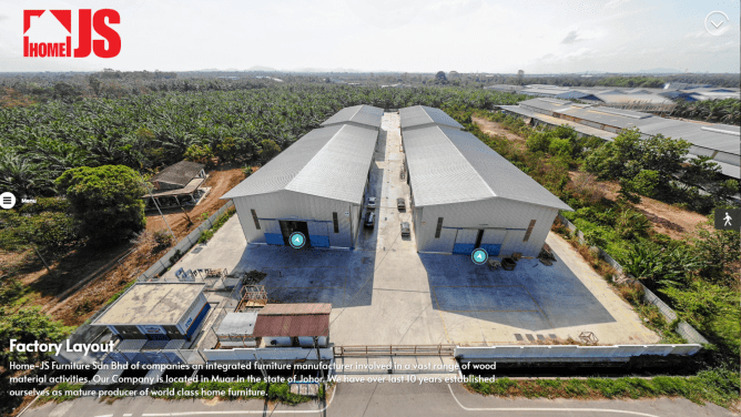 Home JS has an integrated furniture manufacturing facility located in Muar, Johor. Their virtual tour opens with an aerial view amidst a green landscape, with custom points that transport viewers into the production floor, as well as packing and finishing facility.