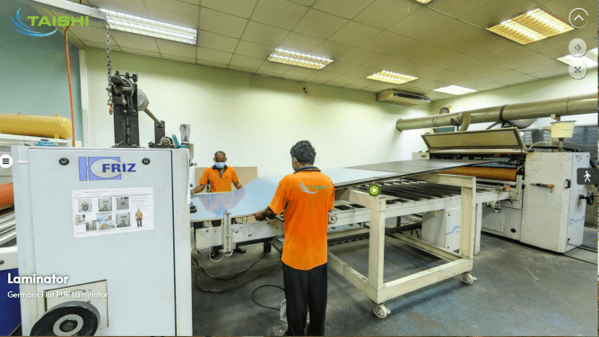 Taishi Tech’s industrial virtual tour emphasises on their innovative manufacturing equipment, such as their Germans Flat PUR Laminator, Germans Panel Saw, and Germans PUR Edging Machine. Custom hotspots reveal videos of the machinery at work.