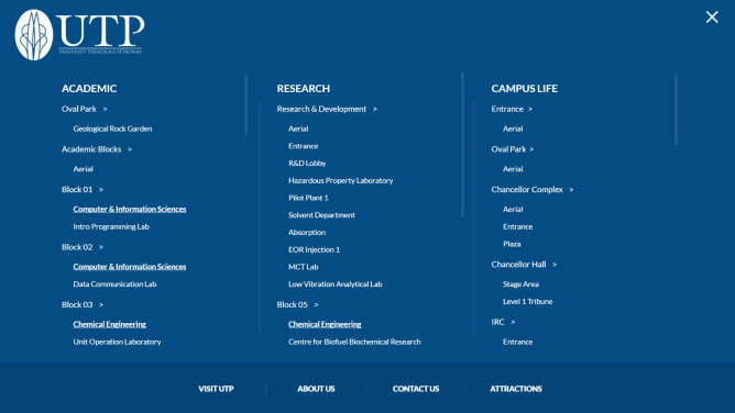 UTP appointed LokaLocal to create a virtual tour for their campus, to highlight their award-winning architecture, laboratories and world-class facilities. We designed a custom look for the virtual tour with three main categories: Academic, Research, and Campus Life.